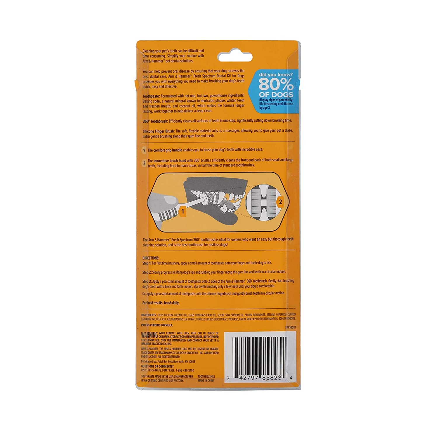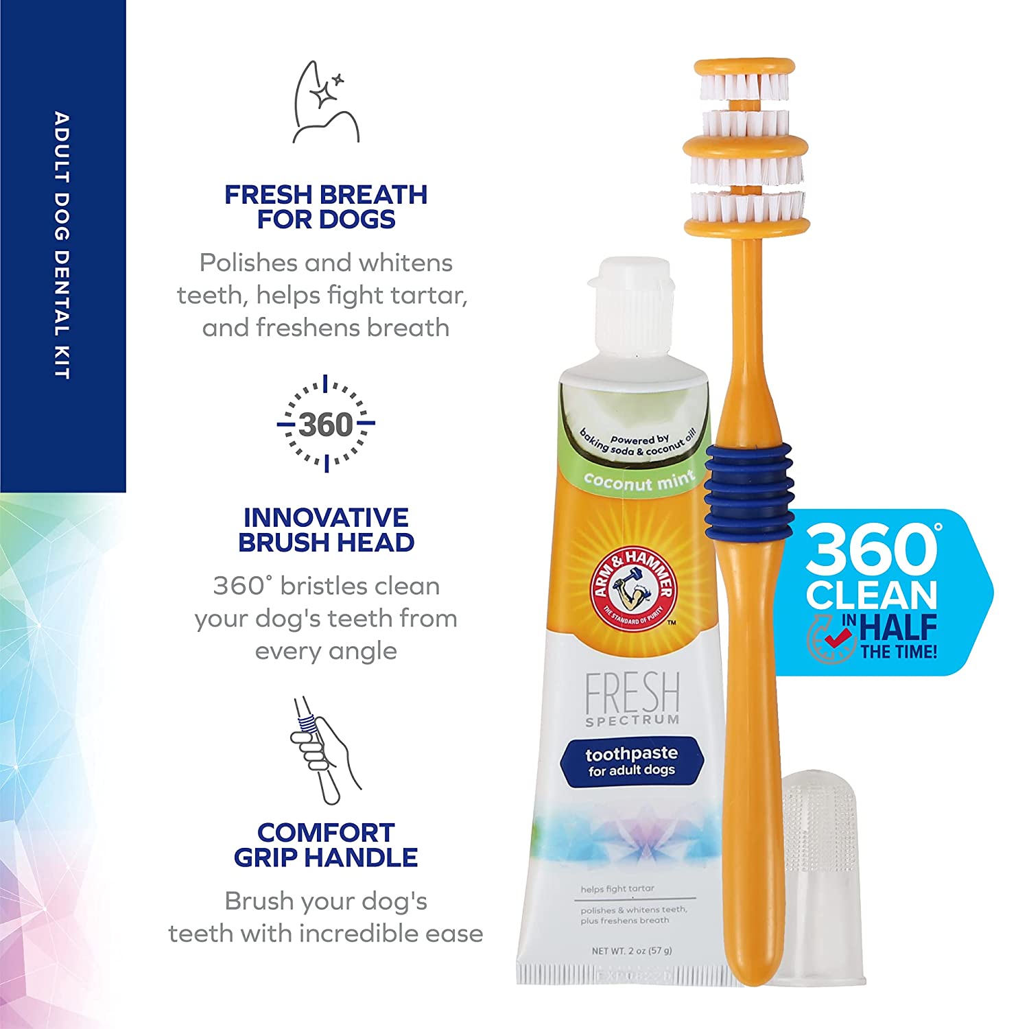 ARM & HAMMER ADULT DOG DENTAL KIT – This all in one dog tooth brushing kit for cleaning adult dog teeth and canines includes a 360 degree toothbrush for dogs, a baking soda Arm & Hammer dog toothpaste for dogs, and a silicone finger brush