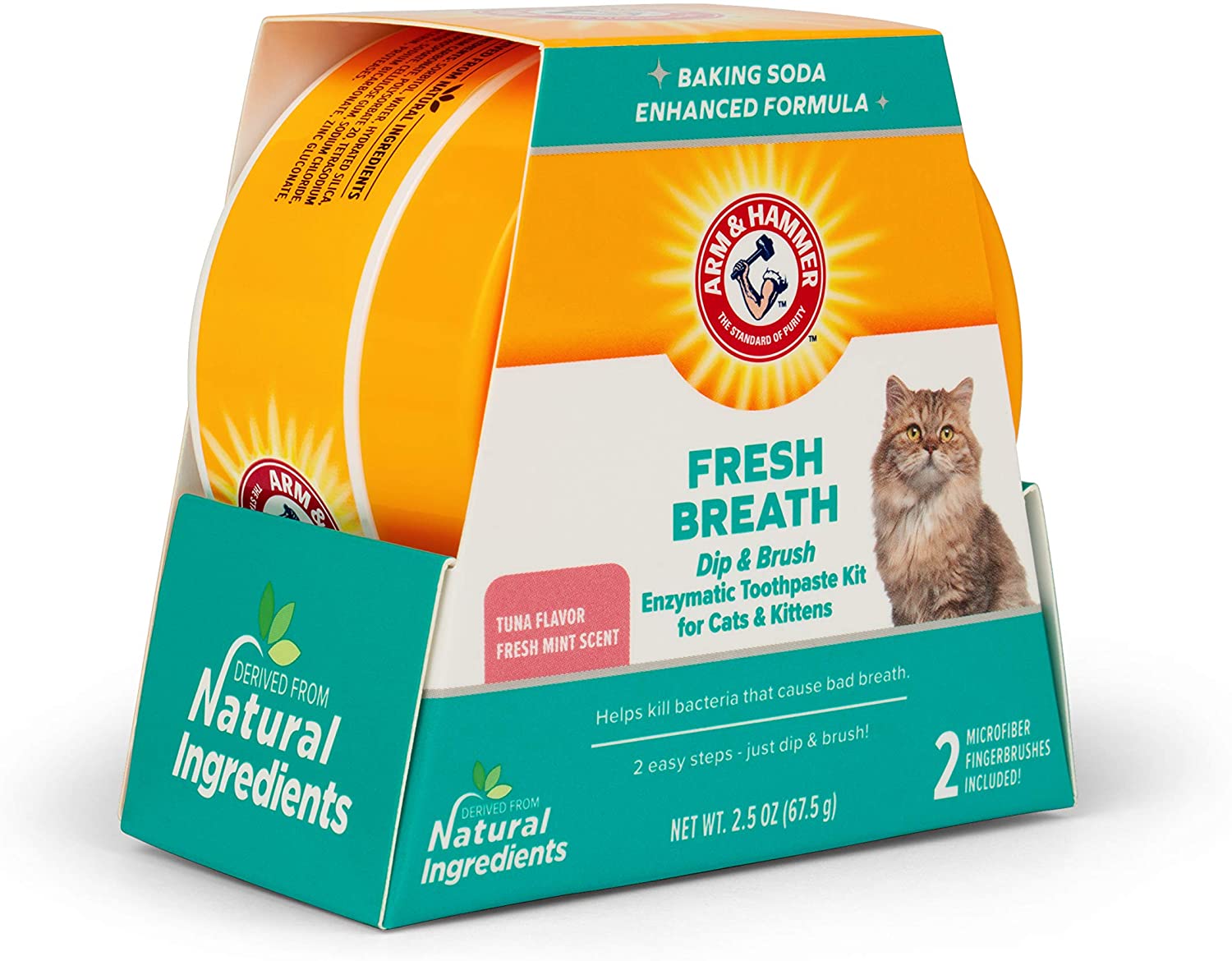 The Arm & Hammer name has been trusted for over 100 years for gentle yet effective cleaning. We now offer Arm & Hammer baking soda dental products for pets to safely clean and maintain healthy cat teeth. The Arm & Hammer Dip & Brush Fresh Breath Enzymatic Toothpaste Kit for Cats and Kittens comes with 2 Microfiber Finger Bushes and a 2.5-ounce tuna flavored cat toothpaste for cat dental care that does it all. The easy-to-use microfiber cat brush is less abrasive than a normal cat toothbrush, making it comfortable and easy to use for all cats and kittens. The new and improved tuna flavored cat toothpaste for kittens and cats is waxier and thicker, giving it the ability to better stick to teeth and result in a deeper clean. This whole cat tooth brushing kit for kittens creates a better experience for cats and kittens for cat dental care you can feel good about.
